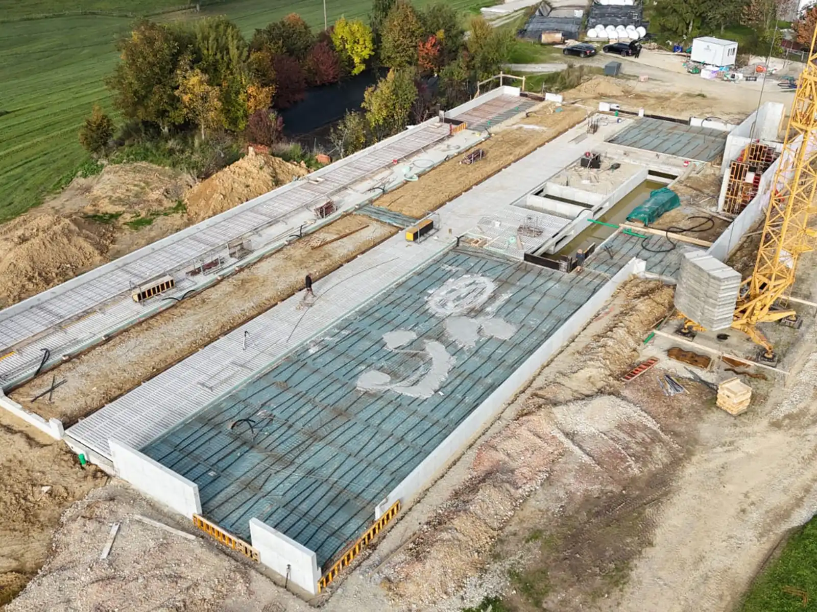 Luftaufnahme einer Baustelle mit Betonfundamenten, Baustellenkran und Erdarbeiten, umgeben von Bäumen und Feldern.